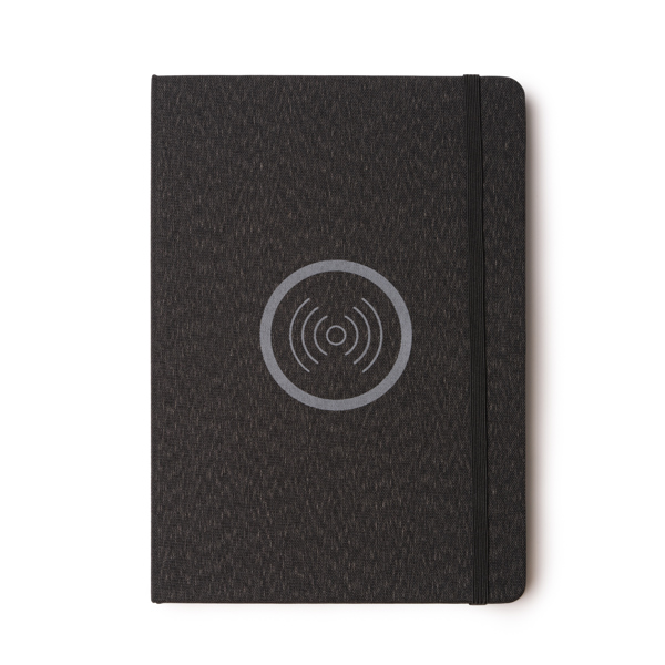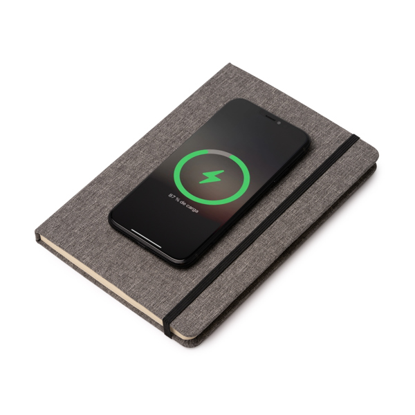 Features: Υφασμάτινη υφή εξωφύλλου, ενσωματωμένος ασύρματος φορτιστής (wireless charger) για smartphones, πλαϊνή θύρα φόρτισης του powerbank, ελαστικό λάστιχο κλεισίματος, γραμμογραφημένες (ριγέ) σελίδες.