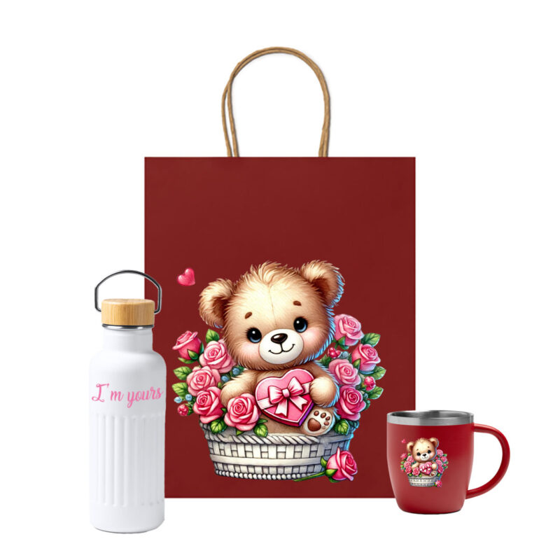Τύπωμα αρκουδάκι: Το εικαστικό με το αρκουδάκι σε καλάθι με τριαντάφυλλα στολίζει την κούπα.