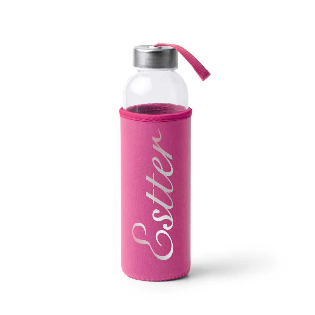 Glass bottle with a capacity of 500 ml and neoprene casing, combined with a coloured carrying strap.