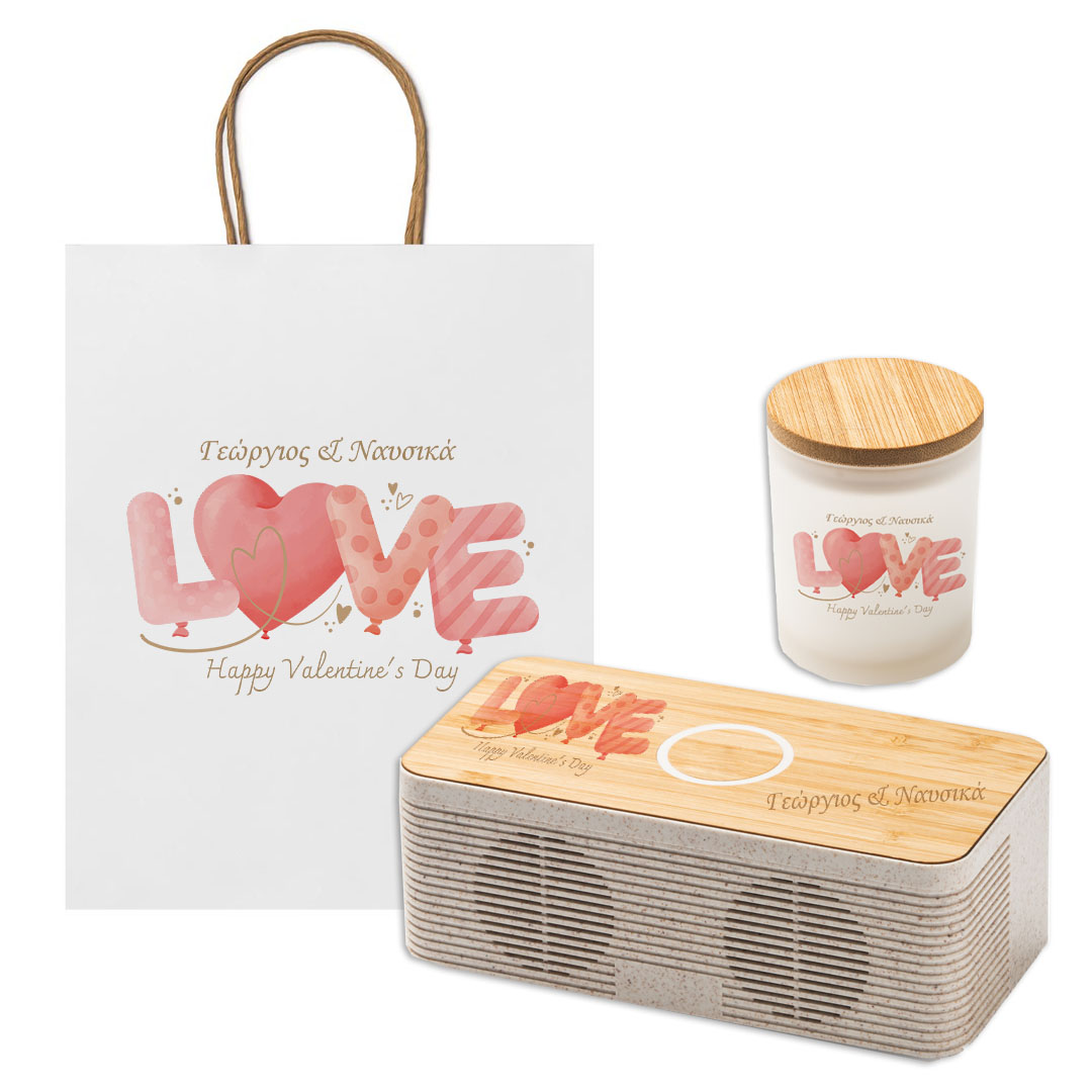 Δημιουργήστε την πιο ρομαντική ατμόσφαιρα με ένα δώρο που φωνάζει “LOVE”! Πράγματι, αυτό το σετ συνδυάζει την οικολογική αισθητική με την αιχμή της τεχνολογίας. Επομένως, χαρίστε μουσική και άρωμα, παρέχοντας την τέλεια εμπειρία χαλάρωσης. Εμείς φροντίζουμε για την προσωποποίηση (“Γεώργιος & Ναυσικά”) και την κομψή, λευκή συσκευασία δώρου.