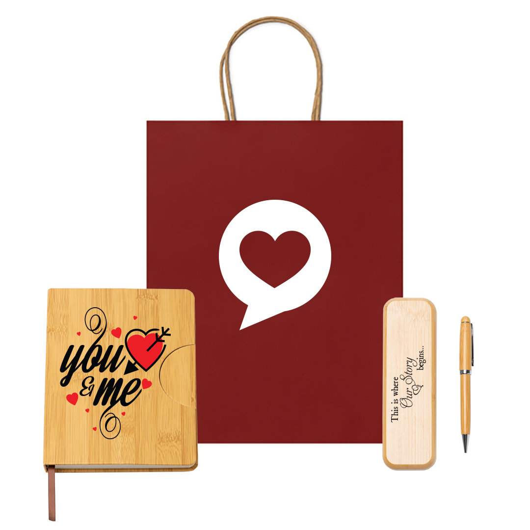 Στη συνέχεια, εστιάζουμε στην πολυτελή ατζέντα με το εξώφυλλο μπαμπού και το σλόγκαν “YOU & ME”. Επιπλέον, το σετ περιλαμβάνει τη μοναδική, ξύλινη θήκη με το γλυκό μήνυμα “This is where Our Story Begins…”. Επομένως, δημιουργείς ένα αναμνηστικό κομμάτι που σηματοδοτεί το ξεκίνημά σας. Εν τω μεταξύ, το στυλό μπαμπού ολοκληρώνει το οικολογικό πακέτο.