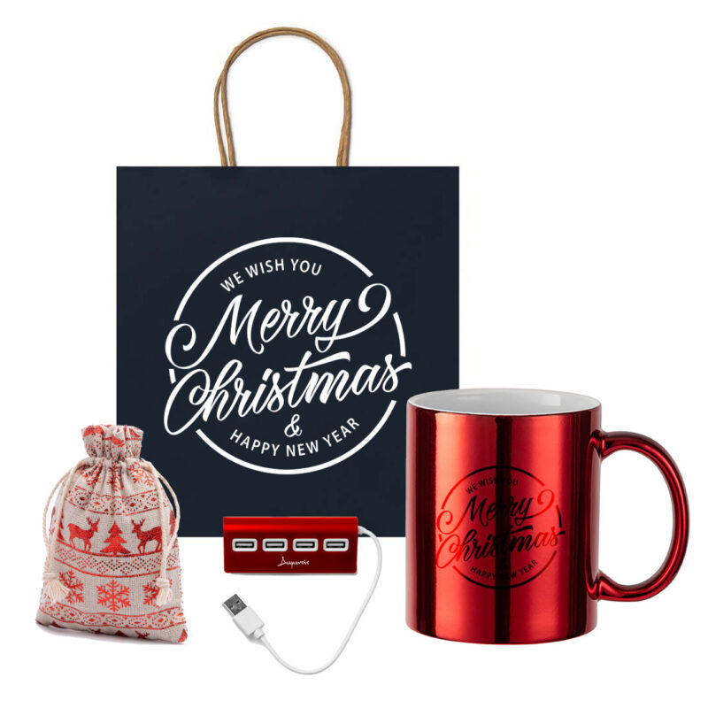 Η τσάντα δώρου είναι διακοσμημένη με εικόνες που σχετίζονται με τα Χριστούγεννα, όπως χριστουγεννιάτικα δέντρα, τάρανδους και νιφάδες χιονιού.