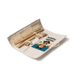 Writing set with bamboo ruler, paper pencil, cardboard pen, wooden sharpener and eraser. Packed in a jute and cotton case.