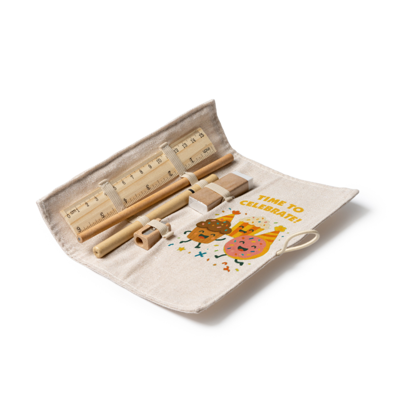 Writing set with bamboo ruler, paper pencil, cardboard pen, wooden sharpener and eraser. Packed in a jute and cotton case.