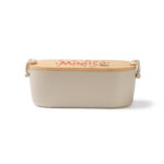 Παράλληλα, τα φυσικά υλικά αναβαθμίζουν την εμπειρία φαγητού. Ειδικότερα, το προϊόν διαθέτει καπάκι από φυσικό μπαμπού που προσθέτει μια νότα πολυτέλειας. Ταυτόχρονα, τα δύο ισχυρά πλαϊνά κλιπ (buckles) κλειδώνουν το καπάκι στη βάση σταθερά. Αυτό το σύστημα εξασφαλίζει στεγανότητα και εμποδίζει τα ατυχήματα. Γι’ αυτό, εσείς τοποθετείτε το δοχείο στην τσάντα σας άφοβα και με σιγουριά.