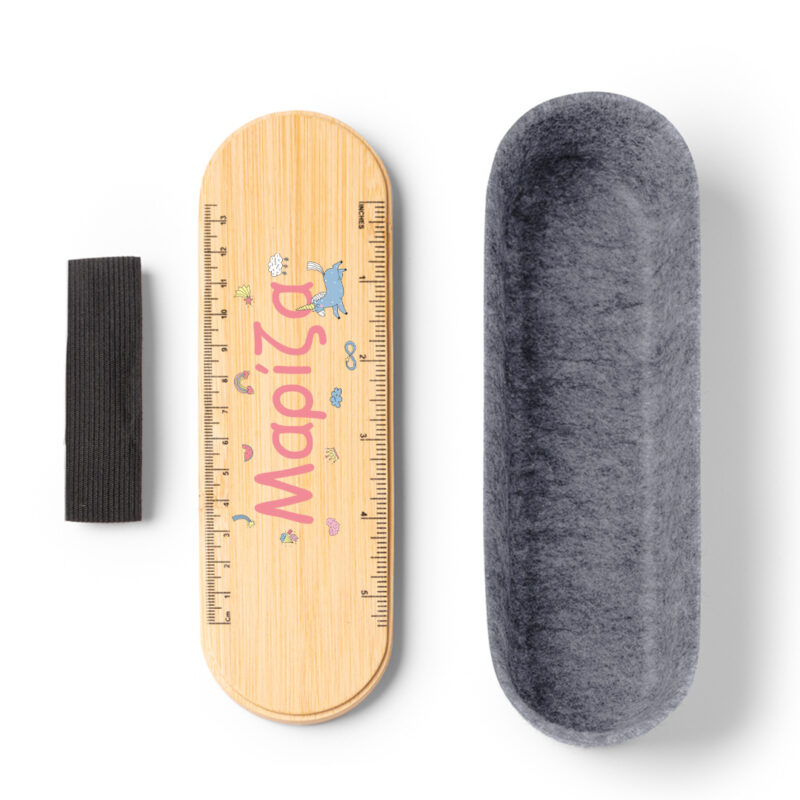 Επιπλέον, η έξυπνη σχεδίαση λύνει προβλήματα. Ειδικότερα, το ξύλινο καπάκι δεν κλείνει απλώς την κασετίνα. Λειτουργεί και ως χάρακας με διαβάθμιση σε εκατοστά (cm) και ίντσες (inches). Οπότε, ο μαθητής έχει πάντα πρόχειρο έναν χάρακα για τις γραμμές του. Εμείς χαράσσουμε ή τυπώνουμε τις ενδείξεις με ακρίβεια. Ταυτόχρονα, τυπώνουμε το όνομα, το λογότυπο ή το σχέδιο που θέλετε στο κέντρο του χάρακα. Γι’ αυτό, το δώρο γίνεται απόλυτα προσωπικό και χρηστικό.