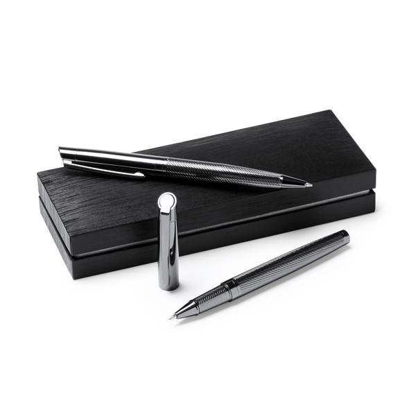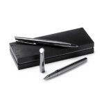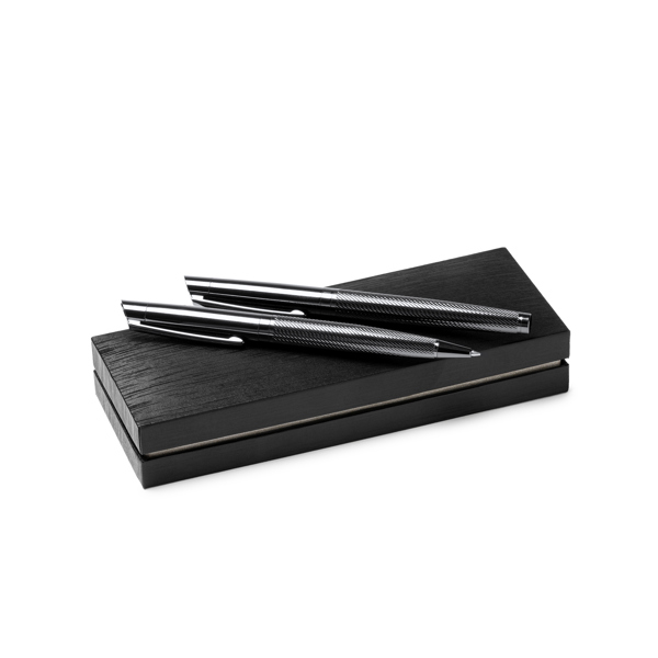 Κομψό σετ στυλό με ρολό και μολύβια με κίνηση, σε σχέδιο σκούρου χάλυβα. Παρουσίαση σε δερμάτινη θήκη με εσωτερική επένδυση.