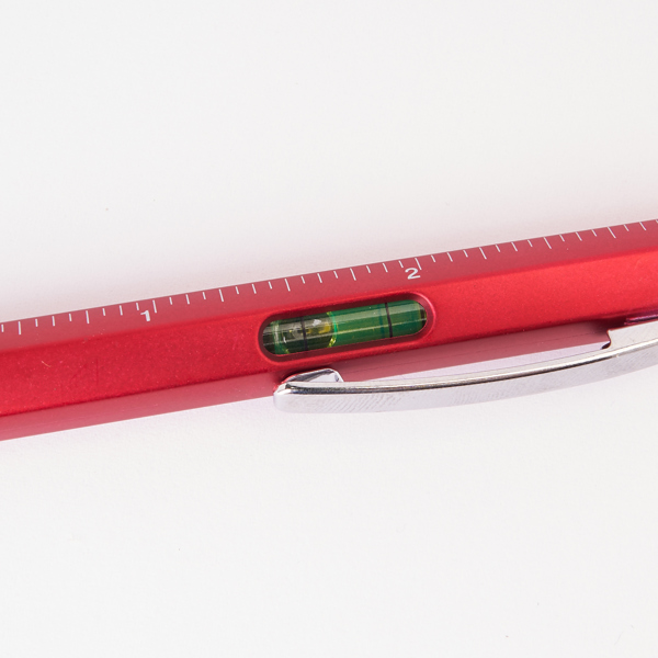 Στυλό πολυεργαλείο 4 σε 1: αλφάδι, χάρακας σε εκατοστά και ίντσες, επίπεδο κατσαβίδι και κατσαβίδι-αστέρι. Κύριο σώμα με μεταλλικό φινίρισμα, περιστρεφόμενος μηχανισμός και μεταλλικό κλιπ. Μπλε μελάνι.