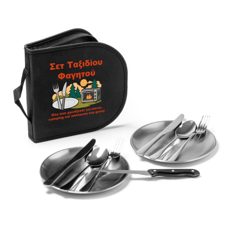 Σετ μαχαιροπίρουνα και πιάτα από ανοξείδωτο ατσάλι. Εξαρτήματα: 2 κουτάλια, 2 πιρούνια, 2 μαχαίρια, πριονωτό μαχαίρι και 2 πιάτα.Συσκευασία σε θήκη από RPET με φερμουάρ για μεταφορά.