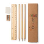 Writing set made of natural wood, in a paper case. Includes ruler, 3 pencils, 1 eraser and 1 sharpener.