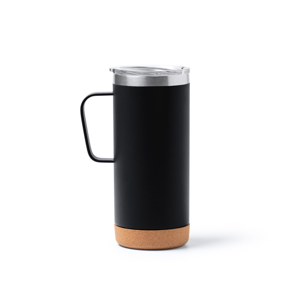 Metallic double-walled glass with cork bottom and transparent safety lid. Capacity 600 ml. Packed in an ecological box.