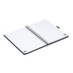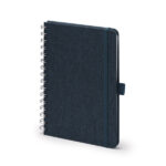Σημειωματάριο A5 με σκληρό εξώφυλλο από ανακυκλωμένο πολυεστερικό ύφασμα RPET και διπλό σπιράλ. Περιλαμβάνει κλείσιμο με ελαστική ταινία και θήκη για στυλό που ταιριάζει με το εξώφυλλο. Περιέχει 80 επενδεδυμένα φύλλα, ιδανικά για οργανωμένες και φιλικές προς το περιβάλλον σημειώσεις.