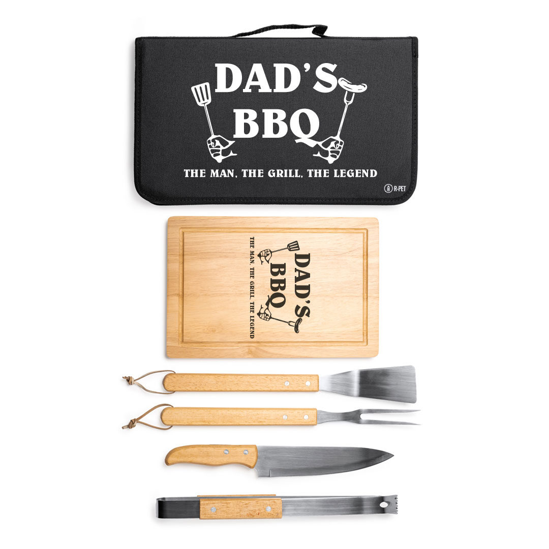 Σετ μπάρμπεκιου. Περιλαμβάνει 4 εξαρτήματα από ανοξείδωτο ατσάλι με ξύλινη λαβή: μαχαίρι, πιρούνα, λαβίδα, σπάτουλα και ξύλινη σανίδα κοπής. Συσκευασία σε θήκη από ανακυκλωμένο πολυεστέρα RPET.
