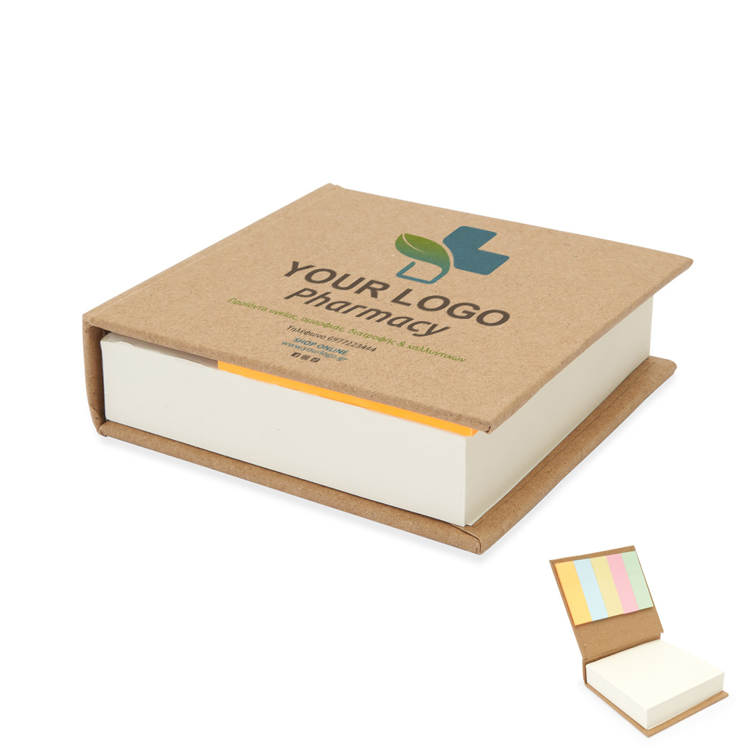 Κλασικό μπλοκ σημειώσεων με εξώφυλλα από ανακυκλωμένο χαρτόνι. Περιλαμβάνονται 200 λευκά φύλλα και 125 αυτοκόλλητοι σελιδοδείκτες σε διάφορα χρώματα. [8,1cm/2,6cm/8,3cm]