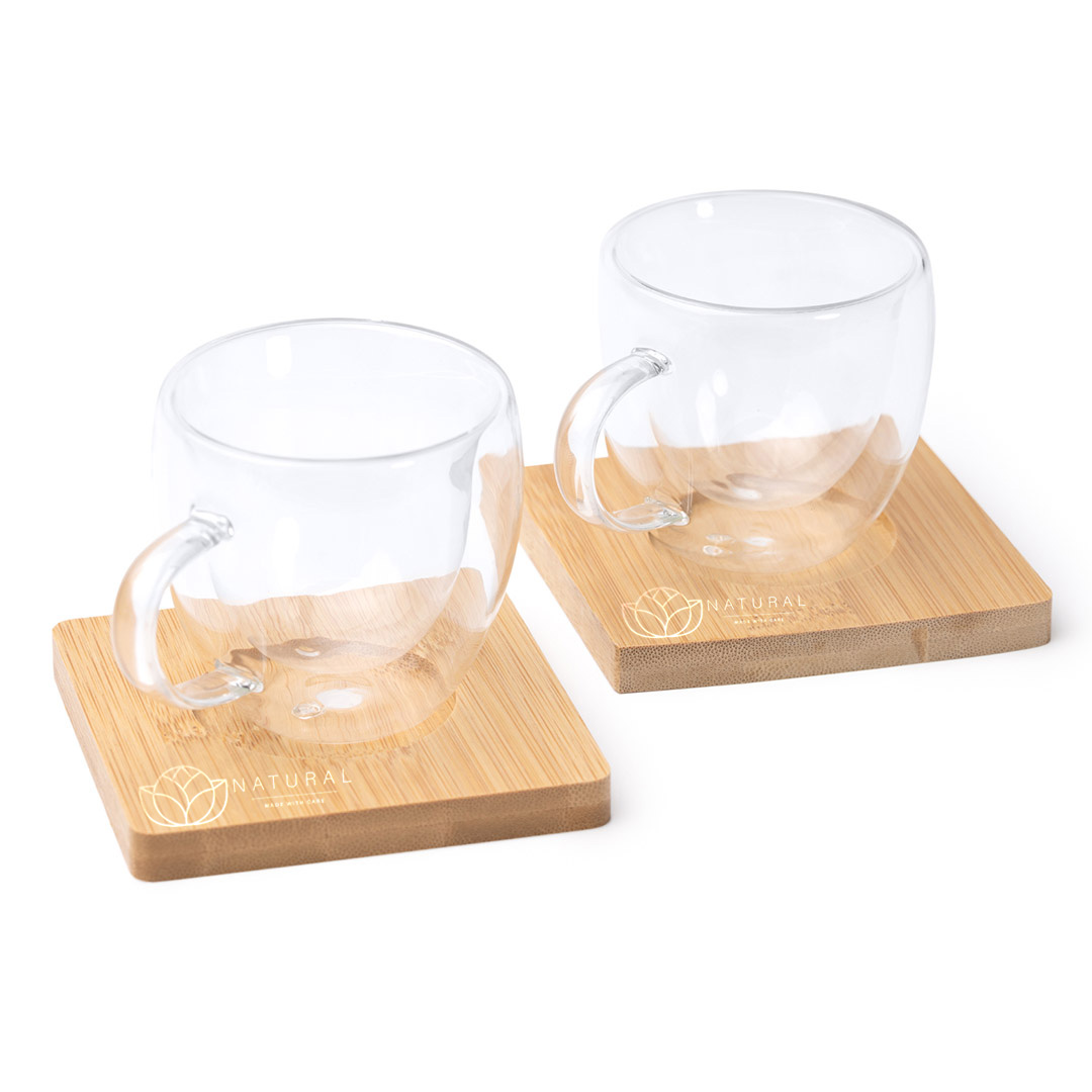 Χαρακτηριστικά: Δύο γυάλινες κούπες με θερμομονωτικό διπλό τοίχωμα για προστασία χεριών, δύο ξεχωριστά τετράγωνα σουβέρ από οικολογικό μπαμπού, χωρητικότητα 90ml ανά κούπα.