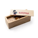 Αρχικά, αυτό το ξύλινο κουτί κρύβει ένα έξυπνο παιχνίδι μυαλού. Συγκεκριμένα, περιέχει ξύλινα γεωμετρικά κομμάτια για τη λύση του γρίφου. Επιπλέον, εμείς εκτυπώνουμε το όνομα του παιδιού στο καπάκι μαζί με τα Στρουμφάκια. Έτσι, το δώρο αποκτά προσωπικό χαρακτήρα. Τέλος, τα φυσικά υλικά προσφέρουν ποιότητα και ασφάλεια.