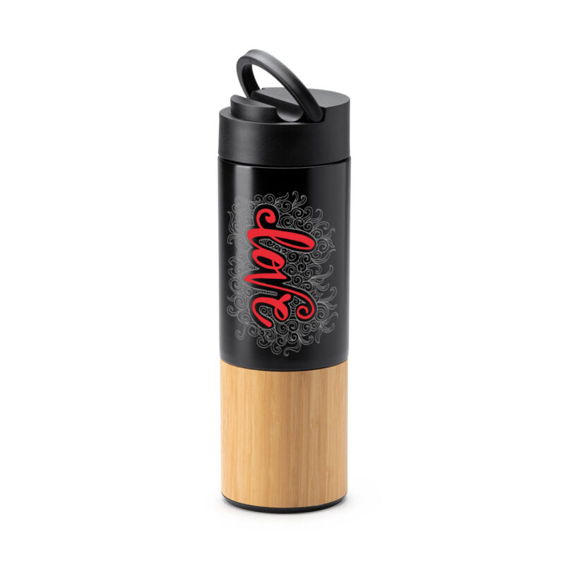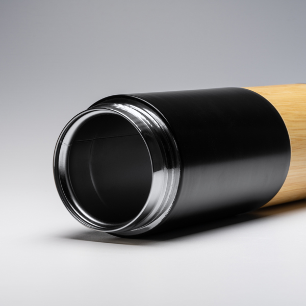 Θερμική φιάλη διπλού τοιχώματος από ανοξείδωτο ατσάλι 304 με λεπτομέρεια από μπαμπού. Ιδανική φιάλη για να διατηρείτε τα ποτά κρύα και ζεστά.