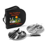 Σετ μαχαιροπίρουνα και πιάτα από ανοξείδωτο ατσάλι. Εξαρτήματα: 2 κουτάλια, 2 πιρούνια, 2 μαχαίρια, πριονωτό μαχαίρι και 2 πιάτα.Συσκευασία σε θήκη από RPET με φερμουάρ για μεταφορά.
