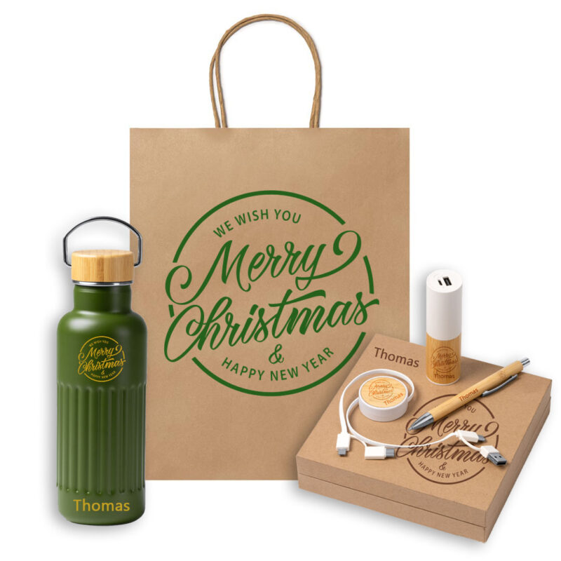 Σετ δώρου που περιλαμβάνει μια εξωτερική μπαταρία 5.000 mAh, κατασκευασμένη από μπαμπού και ανακυκλωμένο ABS, με είσοδο USB και έξοδο Type-C. Περιλαμβάνει επίσης ένα επεκτεινόμενο καλώδιο φορτιστή, κατασκευασμένο από μπαμπού και ανακυκλωμένο ABS, με είσοδο Type-C και USB και έξοδο Type-C και Lightning, καθώς και ένα στυλό μπαμπού με μπλε μελάνι.