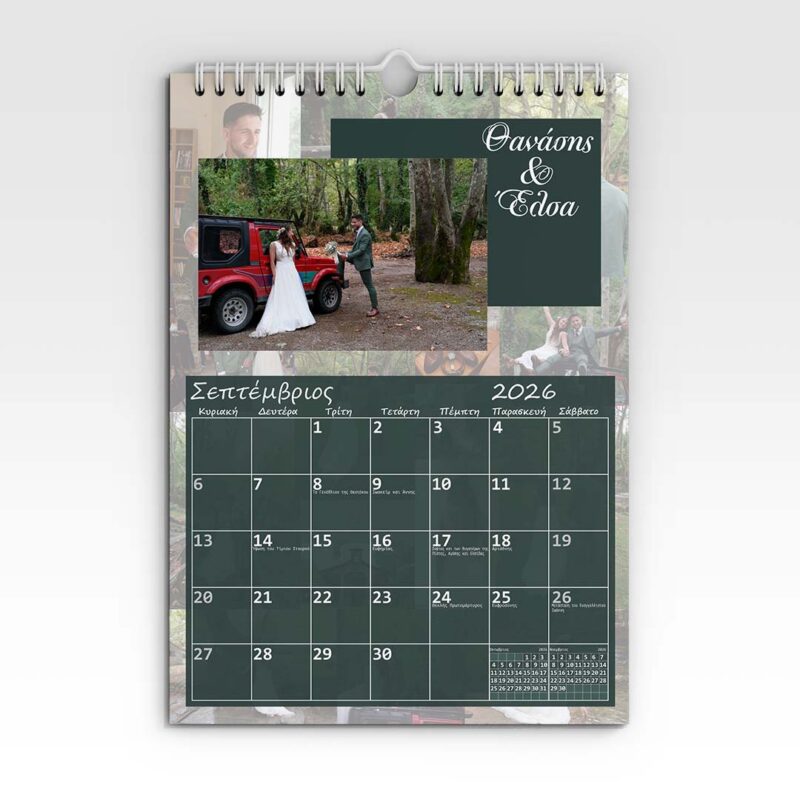 Μετατρέπουμε τις φωτογραφίες του γάμου σας σε ένα ξεχωριστό αναμνηστικό με το Προσωποποιημένο Ημερολόγιο Γάμου 2026 “Με Φωτογραφίες”. Εκτυπώνουμε τις πιο όμορφες στιγμές σας σε κάθε μήνα και δημιουργούμε ένα ημερολόγιο που γεμίζει συναισθήματα και αναμνήσεις. Χρησιμοποιούμε χαρτί υψηλής ποιότητας και σπιράλ δέσιμο για άνεση και αντοχή, ώστε να παραμένει σε άριστη κατάσταση όλο τον χρόνο. Σχεδιάζουμε το ιδανικό δώρο γάμου για συγγενείς και φίλους, που θα θυμίζει κάθε μέρα την πιο σημαντική στιγμή της ζωής σας.