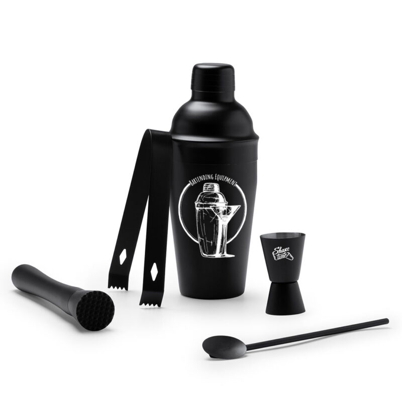 Σετ κοκτέιλ από ανοξείδωτο ατσάλι με μεζούρα, σέικερ 550 ml, λαβίδες, κουτάλι και πολτοποιητή. Συσκευασία σε κουτί με ξεχωριστό σχεδιασμό.25cm/28cm/9cm