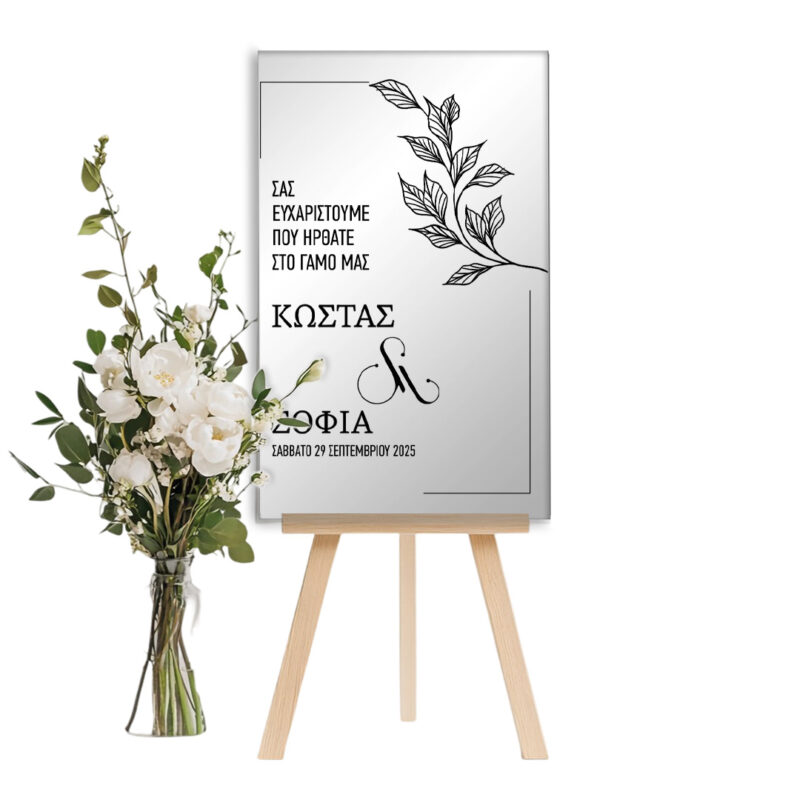 Ο προσωποποιημένος πίνακας από πλέξι γκλας λειτουργεί ως εντυπωσιακό stand υποδοχής, περιλαμβάνοντας φωτογραφία του ζευγαριού και – προαιρετικά – αριθμημένα τραπέζια με τις θέσεις των καλεσμένων.